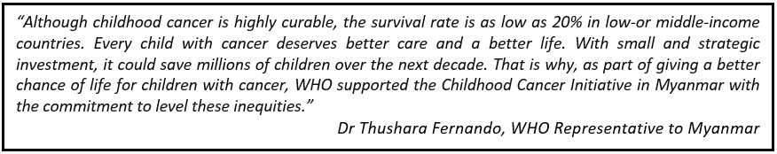 WHO Global Initiative for Childhood Cancer (GICC) was launched by WHO in 2018 along with St. Jude Children’s Research Hospital and other partners with the aim of achieving at least 60% global survival and reducing suffering for all children with cancer by 2030. WHO Regional office for South-East Asia has three GICC focus countries including Myanmar and has established South-East Asia Regional Childhood Cancer Network (SEAR-CCN) to foster collaboration among institutions in improving quality and coverage of care for childhood cancer.