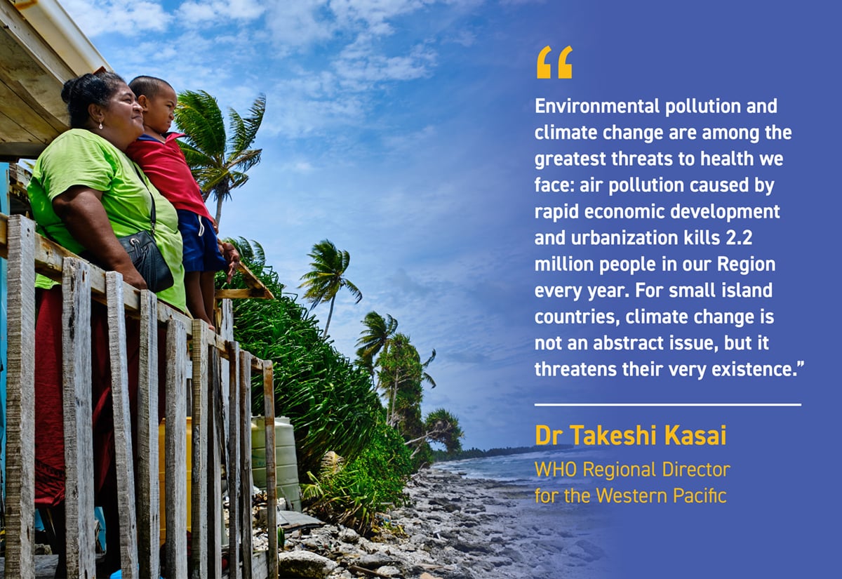 Every year, small island developing states (SIDS), including Pacific Islands countries and areas, make up two thirds of the countries in the Western Pacific Region that suffer the highest relative losses from disasters. Rising sea levels and increasing tropical storms are reducing access to fresh water, degrading beaches and reefs, taking the land where homes and hospitals once stood, and, ultimately, threatening the lives and livelihoods of the people in the Pacific.